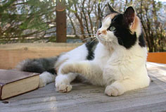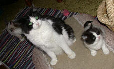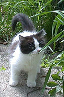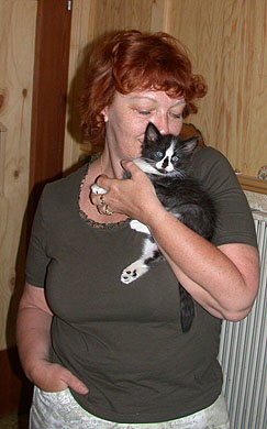 Wir erinnern uns genau, es war der 15. Juni 2004. Jelenka, die kleine Schneeprinzessin, hat sofort - und bis zum heutigen Tag ! - das Herrchen umgarnt und nicht mehr aus den Äuglein gelassen und Iris drückte dem Frauchen ein entzückendes, wunderschön gezeichnetes black-and-white-Katerchen namens Jandokan in den Arm und fügte bedauernd hinzu, dass er sehr schüchtern wäre und nicht mit, für ihn fremden Menschen kuschle. Und siehe da ! Jandokan verliebte sich spontan - auch bis zum heutigen Tag ! - in dieses Frauchen und kuschelte und schmuste mit ihr und wollte gar nicht mehr weg von ihr ! Aber seht mal selbst, die ersten Eindrücke :
