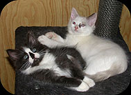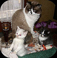 Leider gingen die Beiden innerhalb eines Jahres krankheitsbedingt über die Regenbogenbrücke in den Katzenhimmel und wir waren natürlich sehr sehr traurig. Aber wir wussten : Wir können ohne Katzen nicht leben, und so begaben wir uns auf die Suche. Das war gar nicht leicht, denn junge Katzen gibt es viele, aber der "Funke" sprang nicht über. Und dann entdeckten wir die Homepage von Iris, der ersten RagaMuffins-Züchterin in Europa (siehe unter Links !) RagaMuffins ? Welche Rasse ist das ? Egal. Auf nach Weyer, wir wollen die Kleinen in natura sehen, denn auf der Homepage sahen alle sie einfach entzückend aus ! Gesagt, getan. Und schon standen wir mitten im Kittenzimmer, umgeben von kleinen RagaMuffins, ihren Müttern und - so was kannten wir bisher nicht - auch von ihren Vätern ! Es war wie im Märchen !