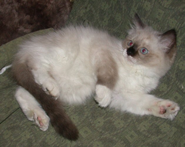 sealpoint Schokopuppy mit dunkler Nase und weißen Pfötchen.